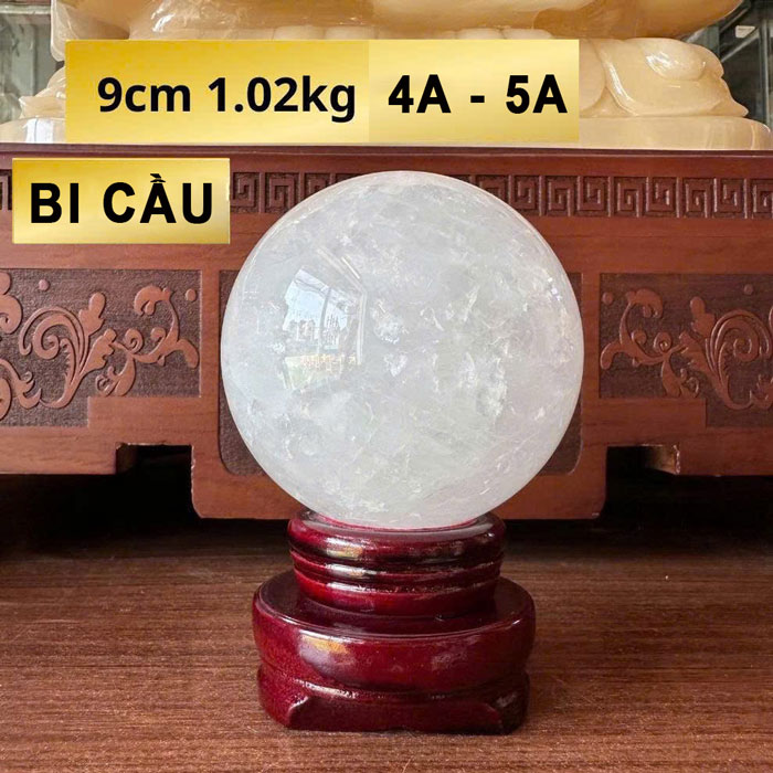 Quả cầu được chế tác từ đá thạch anh trắng tự nhiên nguyên khối, trải qua quá trình gia công tỉ mỉ để đạt độ tròn hoàn hảo và bề mặt sáng bóng. Với trọng lượng 1,02kg, sản phẩm có kích thước vừa phải, dễ dàng bố trí ở nhiều không gian khác nhau.