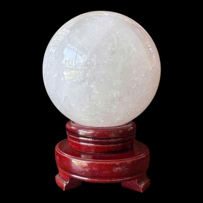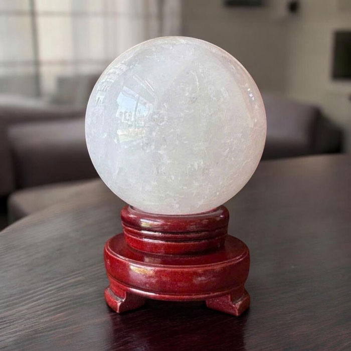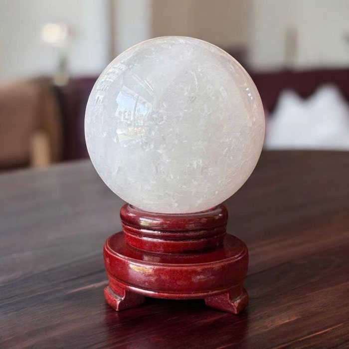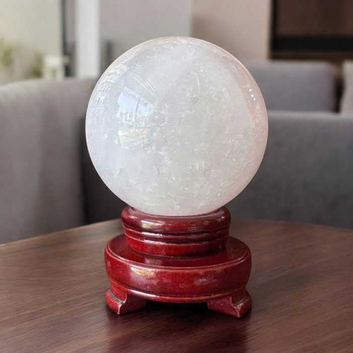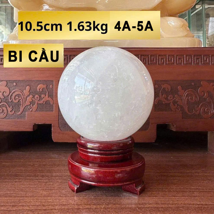 Quả cầu được chế tác từ đá thạch anh trắng nguyên khối, trải qua quy trình gia công tỉ mỉ để đạt độ tròn đều và bề mặt sáng bóng. Trọng lượng 1,63kg mang đến cảm giác chắc chắn, bề thế, phù hợp để trưng bày tại những vị trí trung tâm.