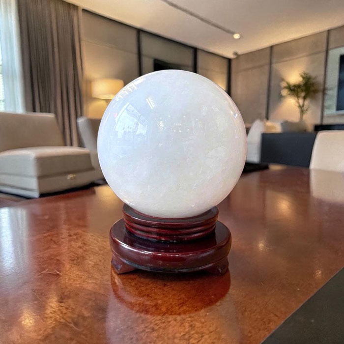 Trong phong thủy, hình cầu tượng trưng cho sự viên mãn, trọn vẹn và cân bằng hoàn hảo. Khi kết hợp với thạch anh trắng – loại đá mang năng lượng thanh khiết, sản phẩm được tin rằng mang lại nhiều lợi ích:
