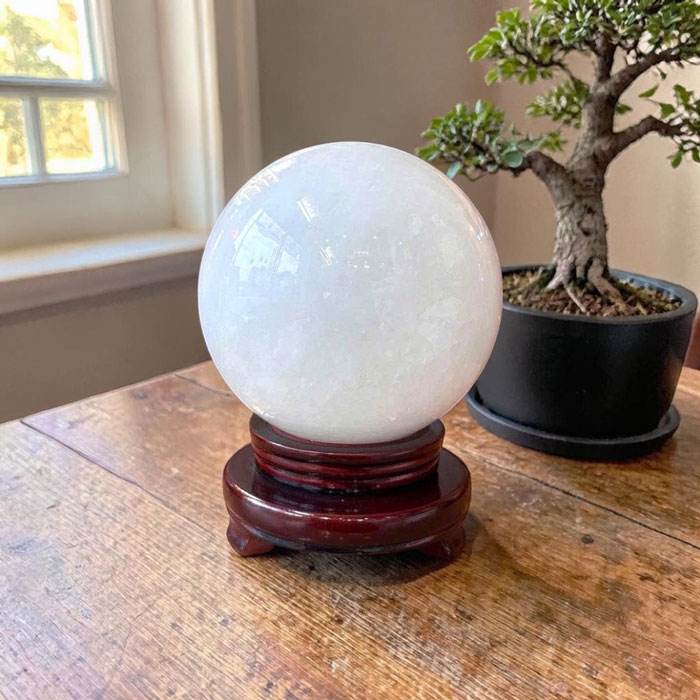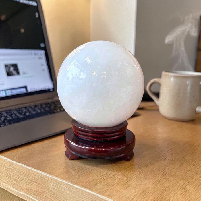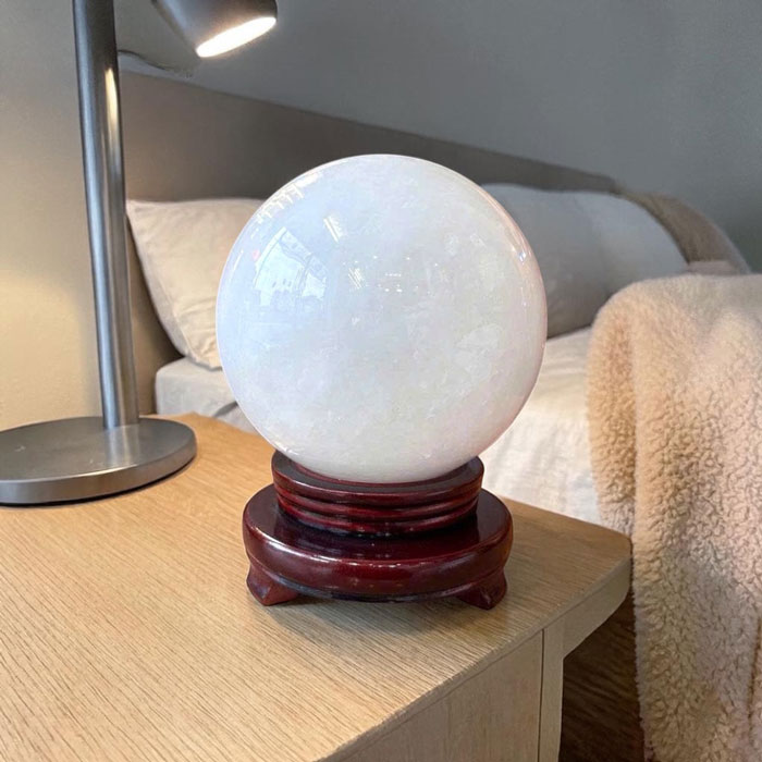 Các đường vân đá tự nhiên bên trong mỗi quả cầu tạo nên vẻ đẹp độc nhất, không trùng lặp. Thạch anh trắng được biết đến như loại đá có khả năng hấp thụ, lưu giữ và khuếch đại năng lượng, giúp cải thiện trường khí trong không gian.