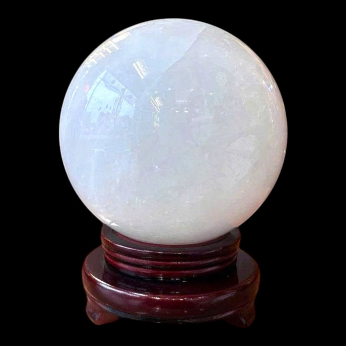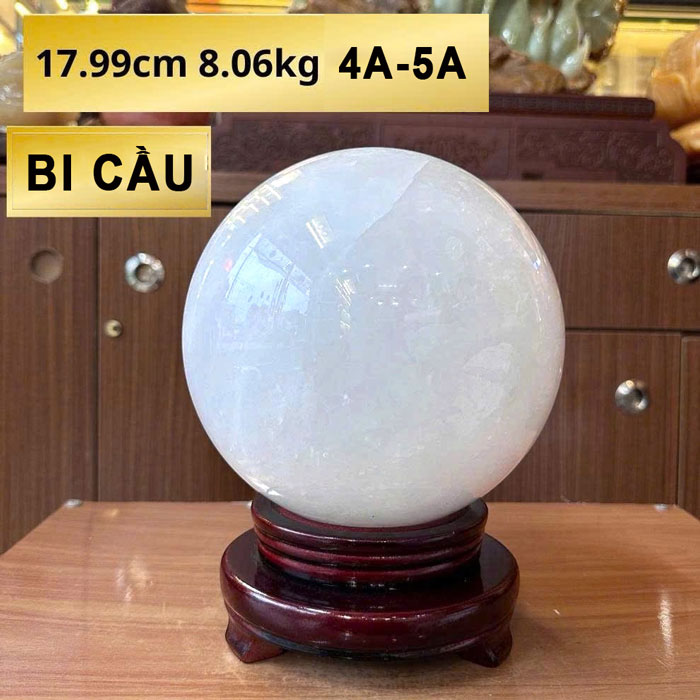 Quả cầu được chế tác từ khối đá thạch anh trắng nguyên khối lớn, trải qua quá trình cắt gọt và đánh bóng công phu để đạt độ tròn đều tuyệt đối cùng bề mặt sáng mịn. Với trọng lượng 8,06kg, sản phẩm mang lại cảm giác vững chãi, sang trọng và cực kỳ nổi bật khi trưng bày.