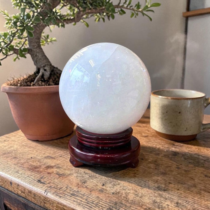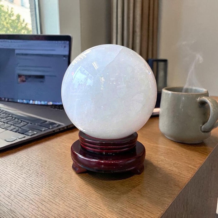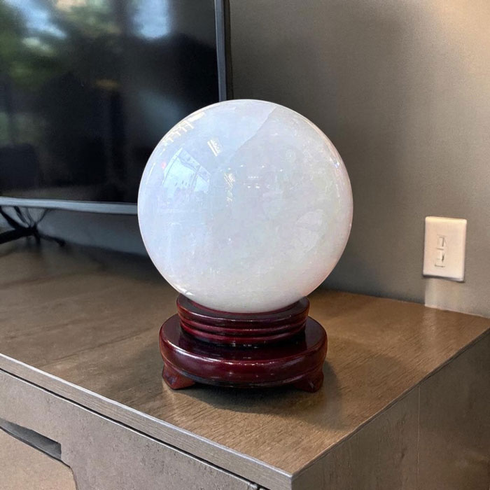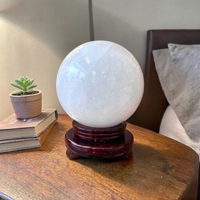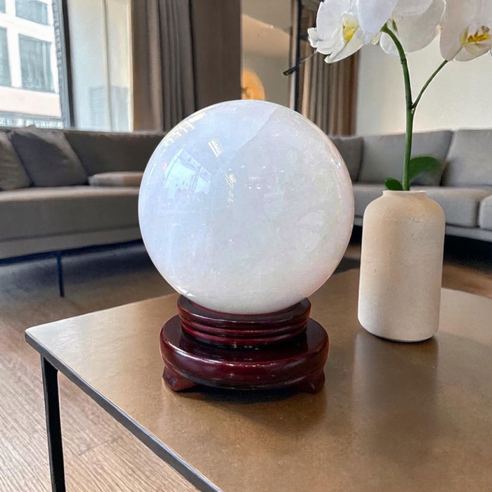 Mỗi quả cầu là một tác phẩm độc nhất nhờ hệ vân đá tự nhiên không trùng lặp. Thạch anh trắng nổi tiếng trong giới phong thủy với khả năng hấp thụ, khuếch đại và điều hòa năng lượng, giúp không gian trở nên hài hòa hơn.